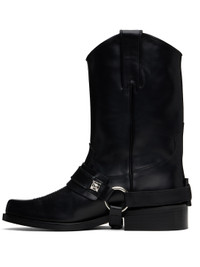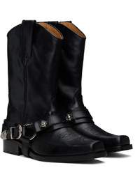 Mid-calf buffed leather boots in black. · Embroidered detailing at square toe · Harness-style strap with signature hardware at vamp · Pull-loops at collar · Buffed leather lining · Stacked leather block heel with rubber injection · Polished leather sole · Silver-tone hardware · Heel: H1.5" Available exclusively at SSENSE. Supplier color: Black Upper: leather. Sole: leather, rubber. Made in Portugal 251688M228001