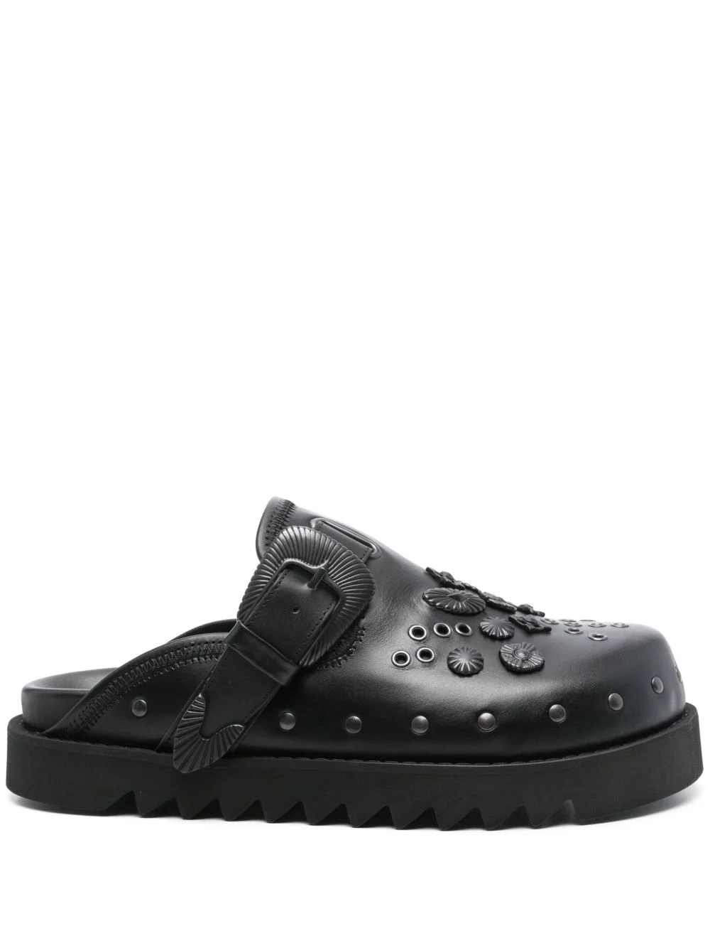 studded slippers Highlights - Black - Buckle-strap fastening - Branded insole - Metal eyelet detailing - Flat sole Imported Composition Sole: Rubber 100% Lining: Fabric 100%, Calf Leather 100% Outer: Calf Leather 100%