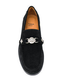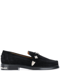western strap loafers Black suede and leather western strap loafers from TOGA VIRILIS featuring a round toe, silver-tone hardware, a branded insole, a flat sole and a metallic detail on the sole . Imported Composition Lining: Calf Leather 100% Sole: Calf Leather 100% Outer: Suede 100% SIZE & FIT FittingInformation This piece fits small – take one size up Measurement Sole height 0.39 in(1 cm) HEEL 0.98 in(2.5 cm)