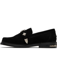 Suede loafers. · Moc toe · Strap with graphic hardware at vamp · Pinched seam at heel counter · Serrated edge at welt · Buffed leather lining · Engraved plaque at heel · Stacked leather heel with rubber injection · Leather sole Available exclusively at SSENSE. Supplier color: Black suede Upper: leather. Sole: leather, rubber. Made in Portugal 252688M231012