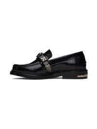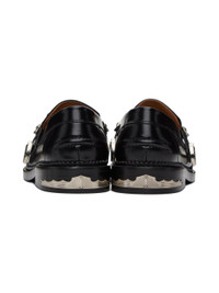 Polished leather loafers in black. Signature hardware at vamp and heel. · Almond moc toe · Suede and buffed leather lining · Serrated detailing at welt · Stacked leather heel with rubber injection · Leather sole Supplier color: Black Upper: leather. Sole: rubber, leather. Made in Portugal 232688M231035