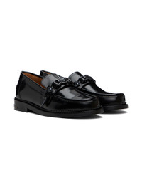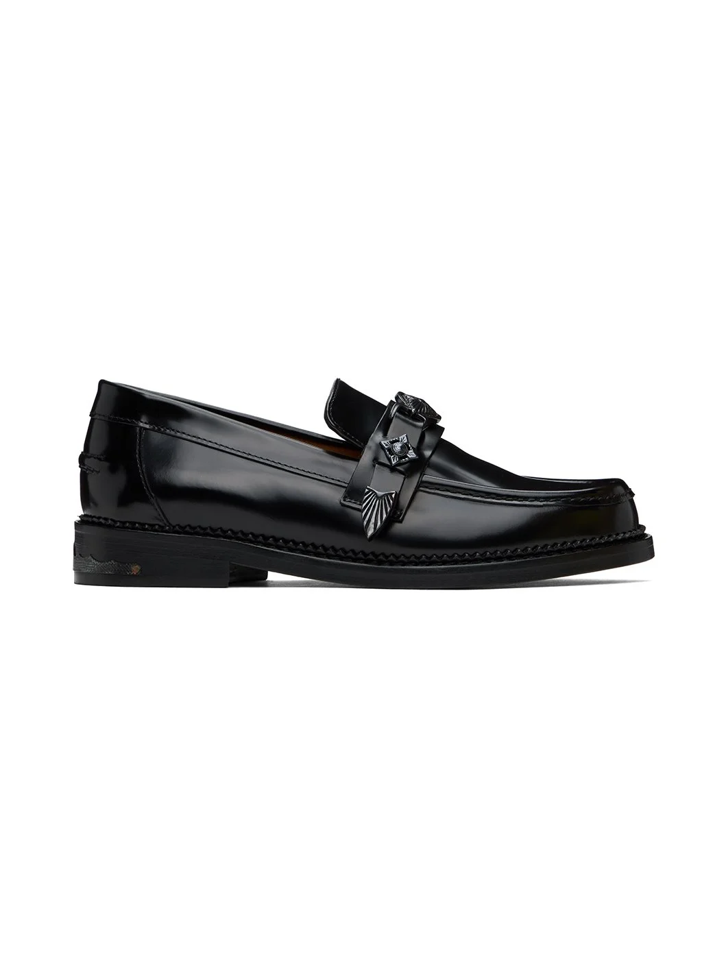 Polished leather loafers in black. · Moc toe · Strap at vamp · Signature graphic hardware at vamp and heel · Pinched seams at heel counter · Serrated detailing at welt · Suede and buffed leather lining · Stacked leather heel with rubber injection · Leather sole · Gunmetal-tone hardware Available exclusively at SSENSE. Supplier color: Black gunmetal Upper: leather. Sole: leather, rubber. Made in Portugal 242688M231010