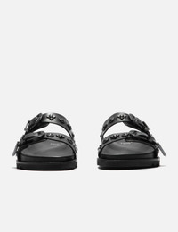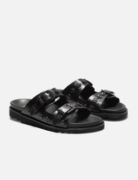- Toga Virilis - Black Leather Gunmetal Hardware Sandal - Signature graphic hardware throughout - Open toe - Pin-buckle straps at vamp - Logo printed at footbed - Foam rubber midsole - Treaded rubber sole - Gunmetal-tone hardware - Color: Black - Material: Leather, Rubber - See more Casual Shoes and Shoes