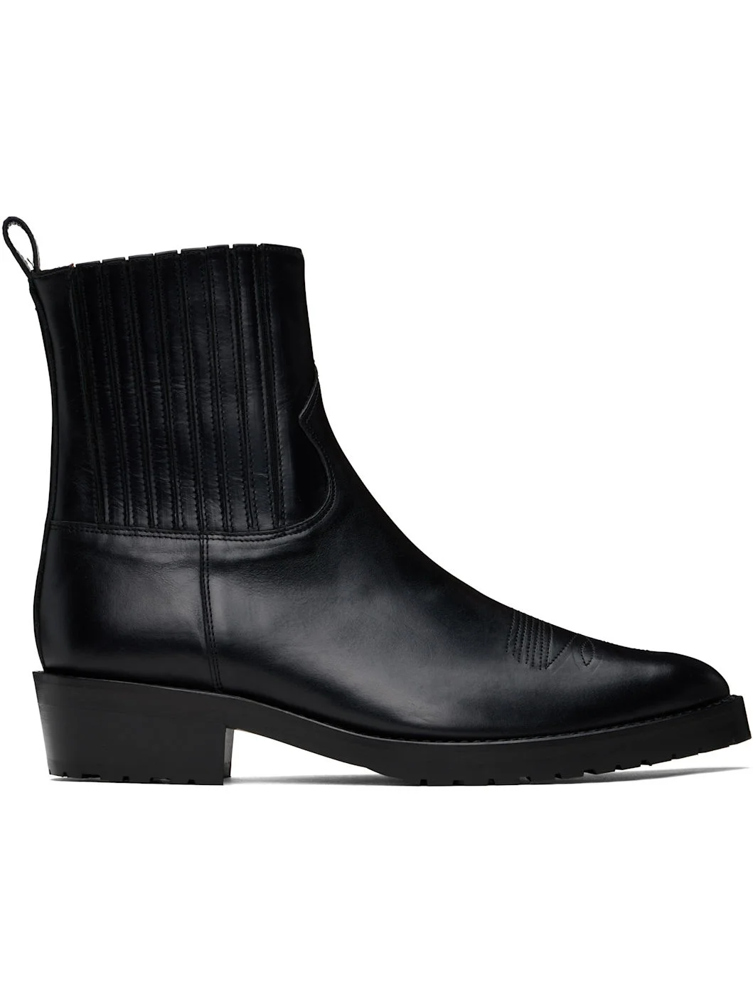 Ankle-high buffed leather Chelsea boots in black. · Embroidered detailing at pointed toe · Concealed elasticized gusset at sides · Pull-loop at heel collar · Buffed leather lining · Stacked leather block heel with rubber injection · Treaded rubber sole · Heel: H1.75" Available exclusively at SSENSE. Supplier color: Black Upper: leather. Sole: rubber. Made in Portugal 251688M223006
