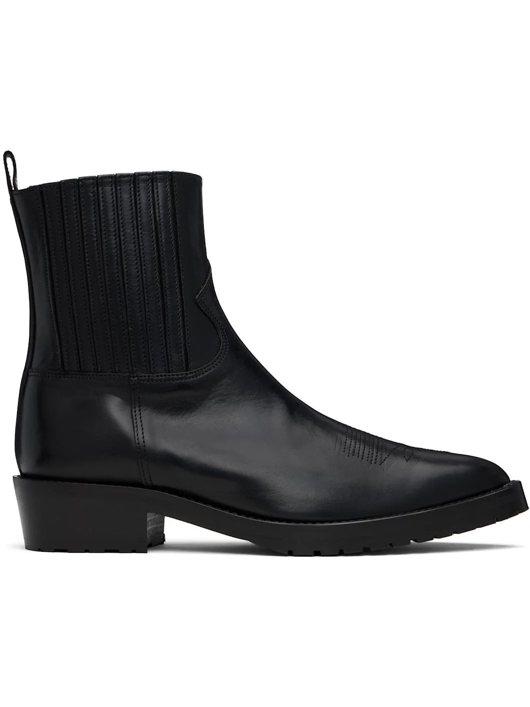 Ankle-high slip-on buffed leather boots. · Pointed toe · Embroidered detailing at vamp · Leather-covered elasticized gussets · Pull-loop at heel collar · Leather lining · Stacked leather heel · Treaded rubber sole · Heel: H1.5" Available exclusively at SSENSE. Supplier color: Black Upper: leather. Sole: rubber. Made in Portugal 252688M223004