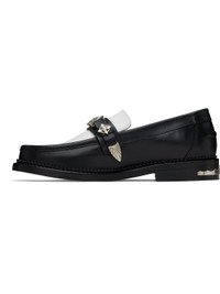 Buffed and polished leather loafers in black and white. · Moc toe · Strap at vamp · Signature graphic hardware at vamp and heel · Pinched seam at heel counter · Serrated detailing at welt · Suede and buffed leather lining · Stacked leather heel · Leather sole with rubber injection · Heel: H1" Available exclusively at SSENSE. Supplier color: Black/White Upper: leather. Sole: leather, rubber. Made in Portugal 251688M231023