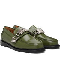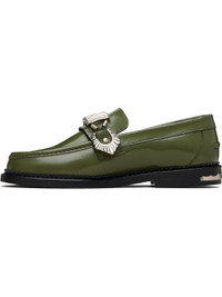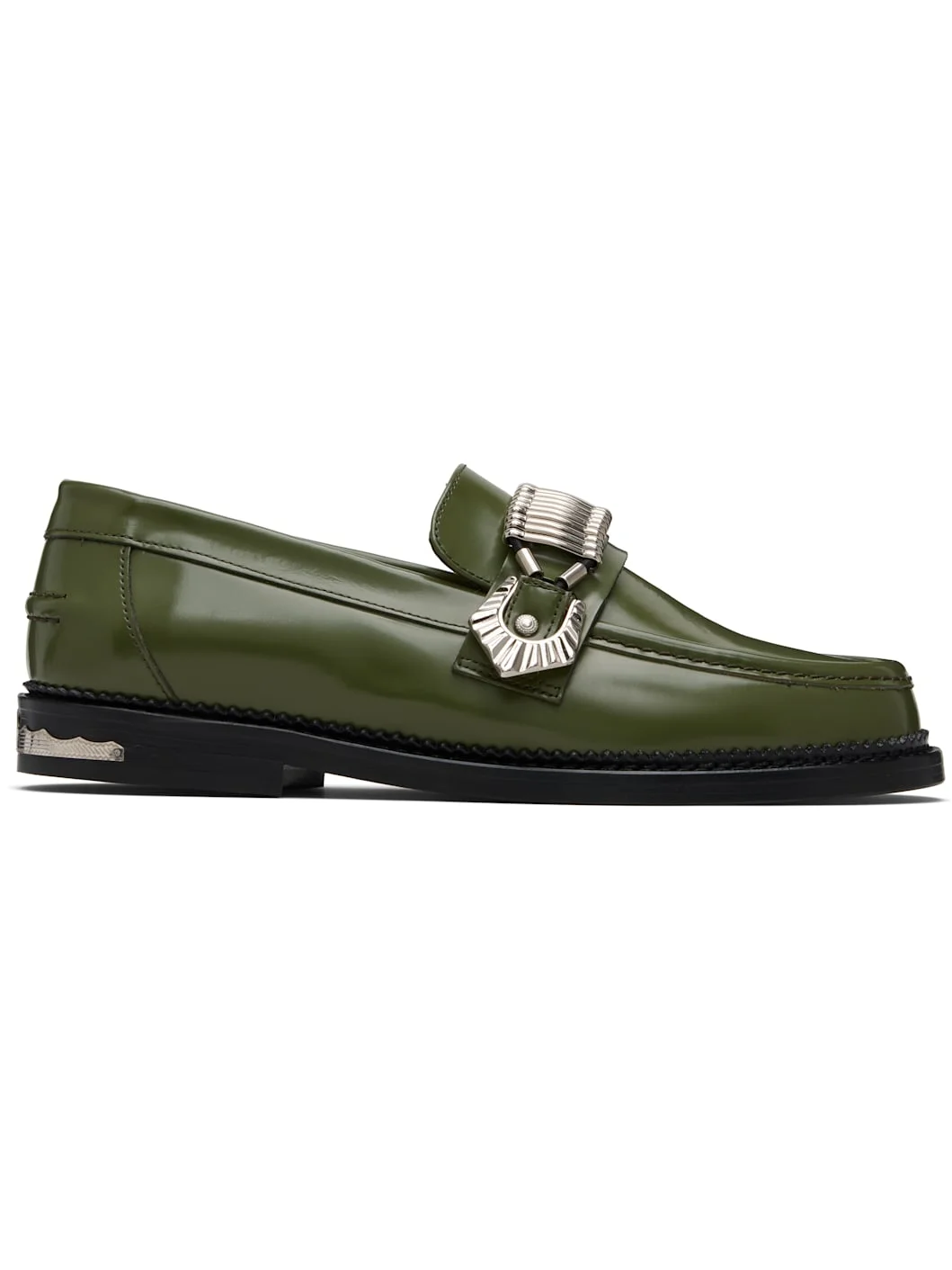 Polished leather loafers. · Moc toe · Strap with hardware at vamp · Pinched seam at heel counter · Serrated edge at welt · Engraved plaque at heel · Stacked leather heel with rubber injection · Leather sole Available exclusively at SSENSE. Supplier color: Khaki Upper: leather. Sole: leather, rubber. Made in Portugal 252688M231008