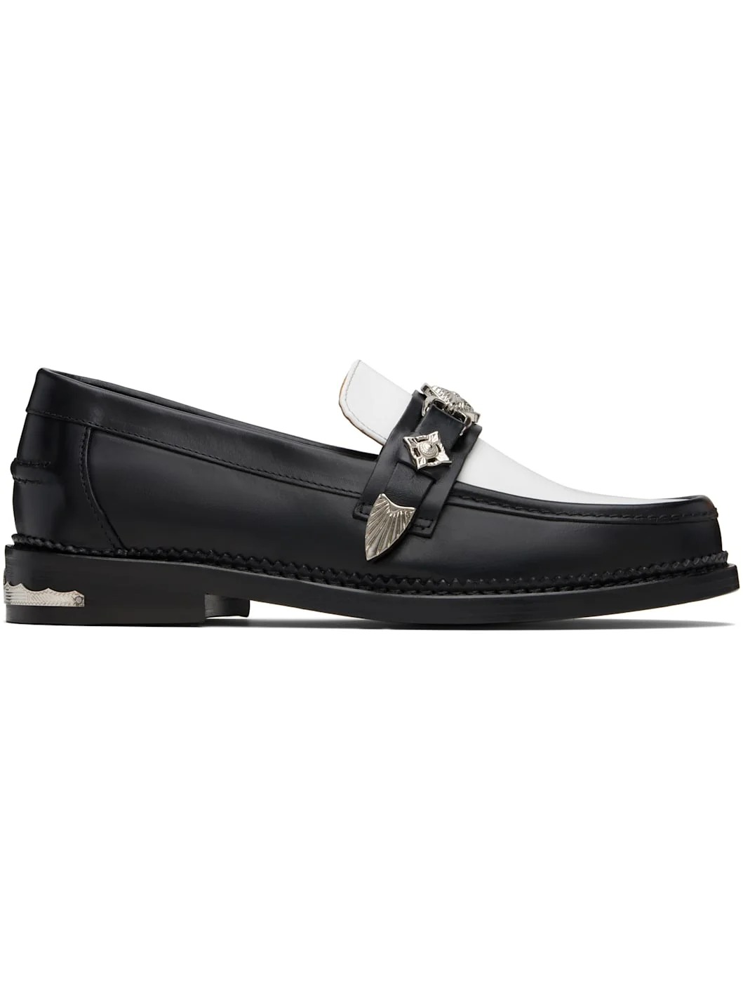 Polished leather loafers. · Moc toe · Strap with graphic hardware at vamp · Pinched seam at heel counter · Serrated edge at welt · Buffed leather lining · Engraved plaque at heel · Stacked leather heel with rubber injection · Leather sole Available exclusively at SSENSE. Supplier color: Black/White Upper: leather. Sole: leather, rubber. Made in Portugal 252688M231014