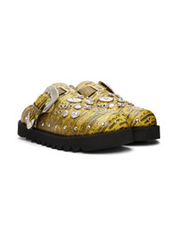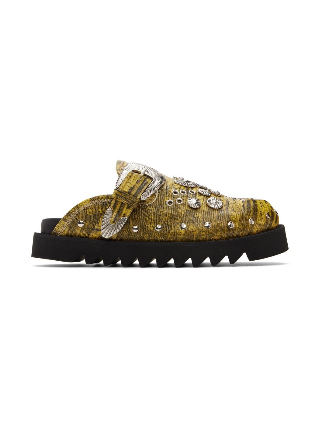 Snake-embossed leather slip-on loafers in yellow. Eyelets, studs, and signature graphic hardware throughout. · Pin-buckle strap at vamp · Padded tongue · Logo printed at molded leather footbed · Mesh lining · Foam rubber midsole · Treaded rubber sole · Silver-tone hardware Available exclusively at SSENSE. Supplier color: Yellow embossed