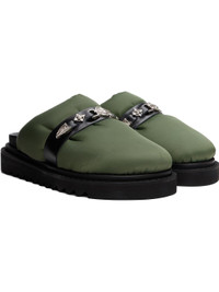 Padded nylon taffeta slip-on loafers in green. · Leather strap with graphic hardware at vamp · Logo printed at molded leather footbed · Twill lining · Topstitching at welt · Foam rubber midsole · Treaded rubber sole · Silver-tone hardware Supplier color: Green