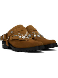 Suede slip-on loafers in tan. Signature graphic hardware, eyelets, O-rings, and pin-buckle strap at detachable harness-style overlay. · Square toe · Embroidered detailing at vamp · Suede and buffed leather lining · Plaque at stacked leather block heel · Lugged rubber sole · Heel: H1.75" Supplier color: Khaki Upper: leather. Sole: rubber. Made in Portugal 251688M231010