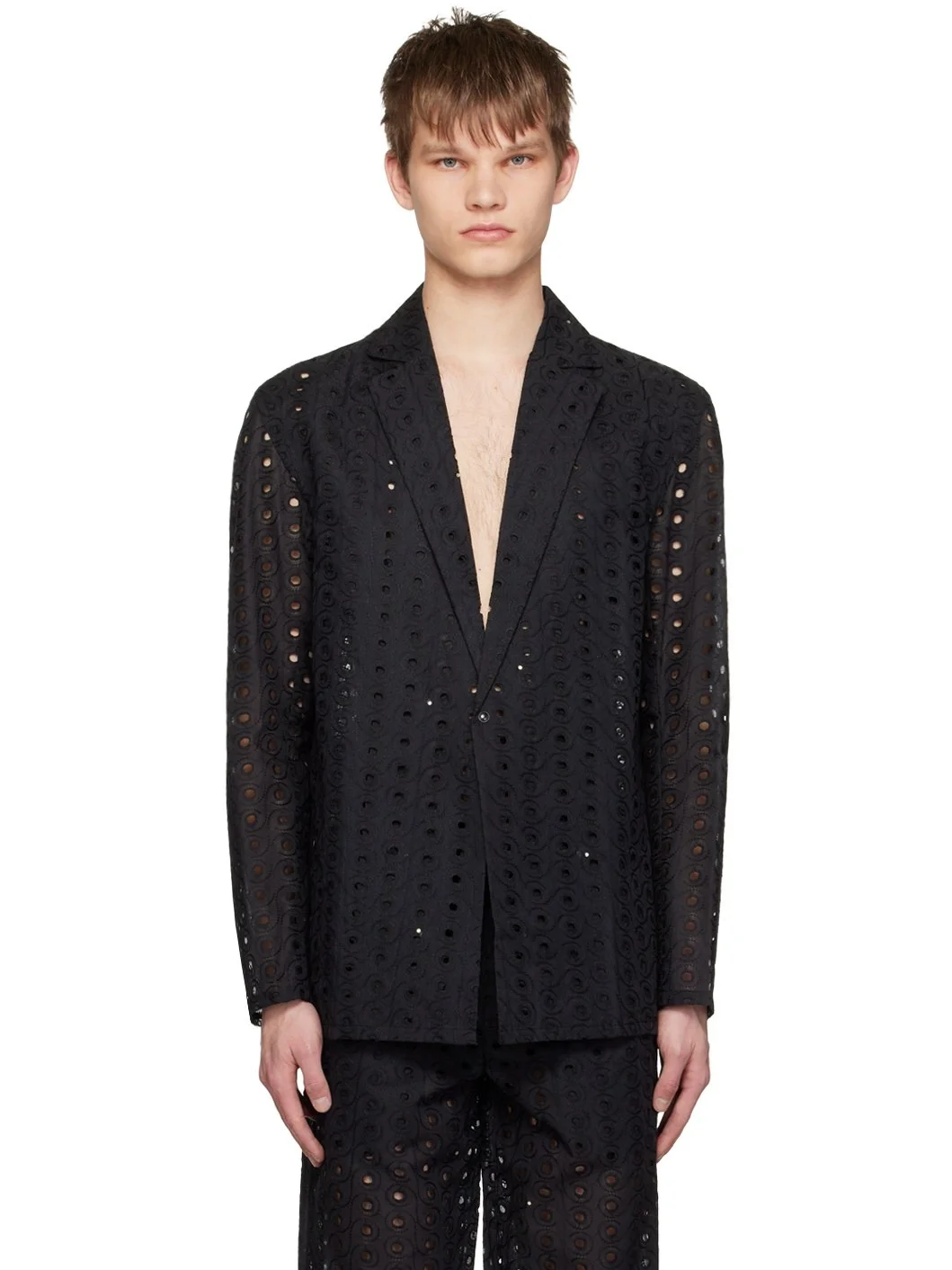 Semi-sheer cotton broderie anglaise blazer. Embroidered detailing and crystal-cut accents throughout. · Notched lapel · Press-stud closure · Central vent at back hem · Unlined Supplier color: Black 100% cotton. Made in Turkey 231314M195006