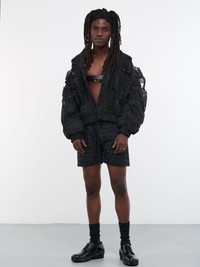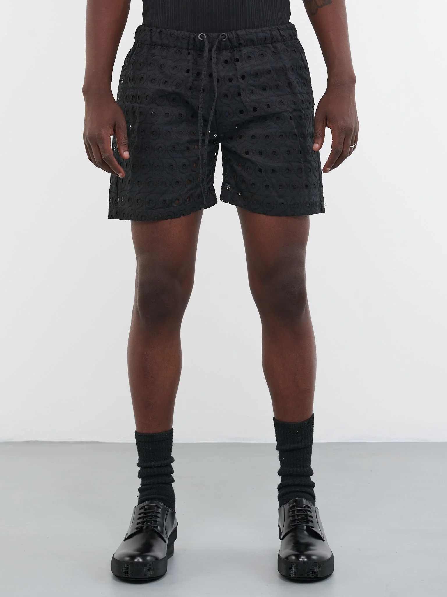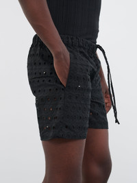 TOKYO JAMES shorts in black, lace construction, elastic waist, tonal adjustable drawcord, side seam pockets, short length, regular fit. Standard Sizing Model is 6’0” wearing size M. Shoulders: 18” Chest: 33” Waist: 28”