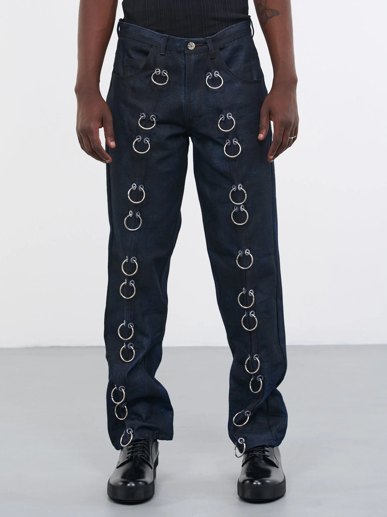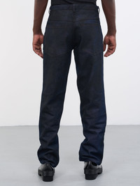 TOKYO JAMES jeans in navy, denim construction, spray painted, pierced seam detailing, mid-waist, belt loops, button & zip-fly, four pockets, straight leg, regular fit. Standard Sizing 100% Cotton Model is 6’0” wearing size M. Shoulders: 18” Chest: 33” Waist: 28”