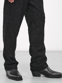 TOKYO JAMES black pants, tailored design, glitter knit, zip puller detail, mid-waist, belt loops, snap button & zip-fly, four pockets, leg creases, regular fit. Standard Sizing Model is 6’0” wearing size L. Shoulders: 19” Chest: 39” Waist: 30”