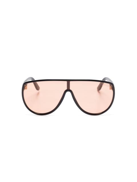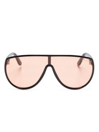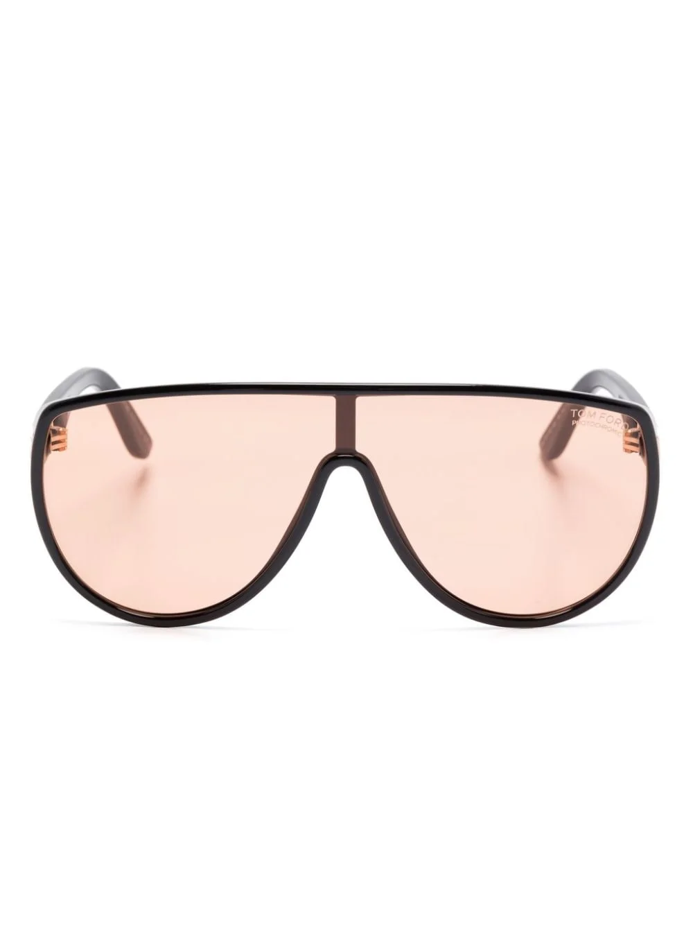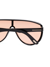 Achilles sunglasses Highlights - Black - Acetate - High-shine finish - Shield frame - Orange tinted lenses - Uv-protective lenses - Lens decal - Signature t-shaped hinge detail - Straight arms - Logo plaque - Curved tips - These glasses come with a protective case. Made In Italy Composition Acetate 100% SIZE & FIT Measurement Arm Length 5.7 in(14.5 cm) Bridge Width 0.55 in(1.4 cm) Lens Diameter 2.44 in(6.2 cm) Total Width 5.7 in(14.5 cm)