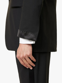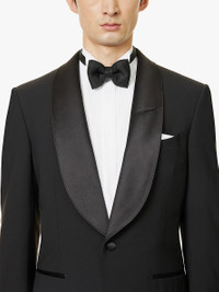 PRODUCT DETAILS - Tom Ford wool suit - 96% wool, 4% elastane; contrast 100% satin; lining 59% cupro, 41% silk - Button fastening - Blazer: Regular fit, single breasted, contrast shawl lapels, padded shoulders, long sleeves, welt pocket at chest, pockets at front, open vent at back, lined - Trousers: Regular fit, mid-rise, straight leg, structured waistband with adjusters, slip pockets at front, pockets at back, contrast trims at sides, pressed centre creases, unfinished hems - ready for tailoring - Dry clean only - Made in Italy - Size UK 40: length 30in / 76cm, chest 40in / 102cm - Size UK 40: rise 12in / 31cm, inside leg 37in / 94cm, leg opening 15in / 38cm - Model is 6ft 2in/1.88m and wears a size UK 40 - Midweight, non-stretch - Please note that altered garments cannot be returned in-store or online. Ref: R04340777