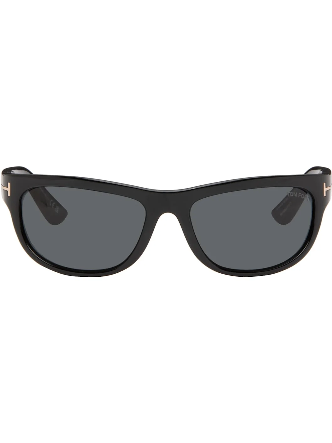 Wraparound acetate-frame sunglasses. · Gray lenses · 100% UV protection · Logo etched at lens · Integrated nose pads · Logo hardware at temples · Logo plaque at temple tips · Includes case · Size: 62.17 120 Supplier color: Black Acetate. Made in Italy 261076M134031
