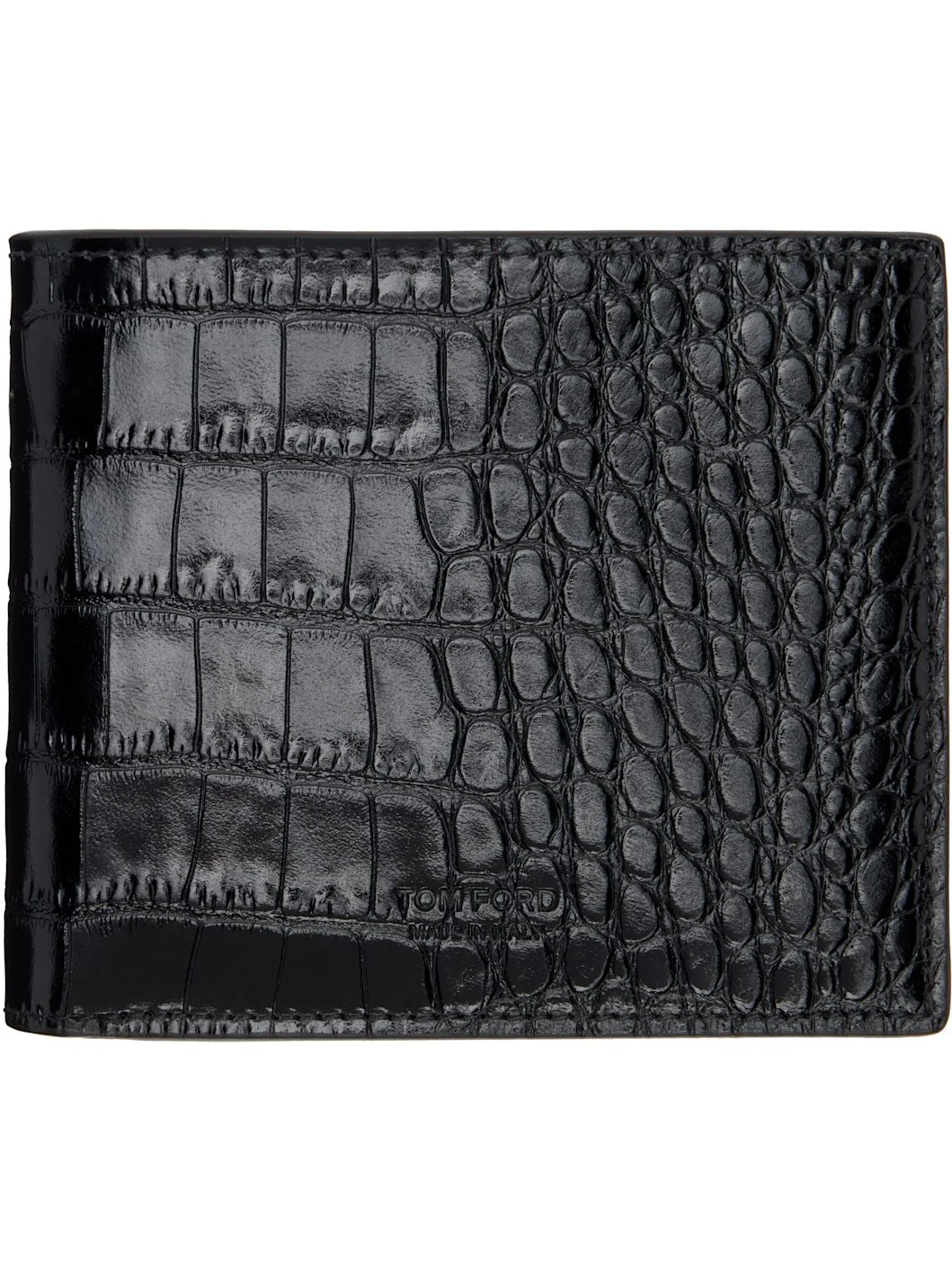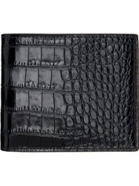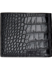 Polished croc-embossed calfskin bifold wallet. · Logo embossed at face · Eight card slots and two patch pockets · Single note slot · Grained calfskin interior · Canvas lining · H3.5" x W4.25" Supplier color: Black Calfskin. Made in Italy 261076M164008