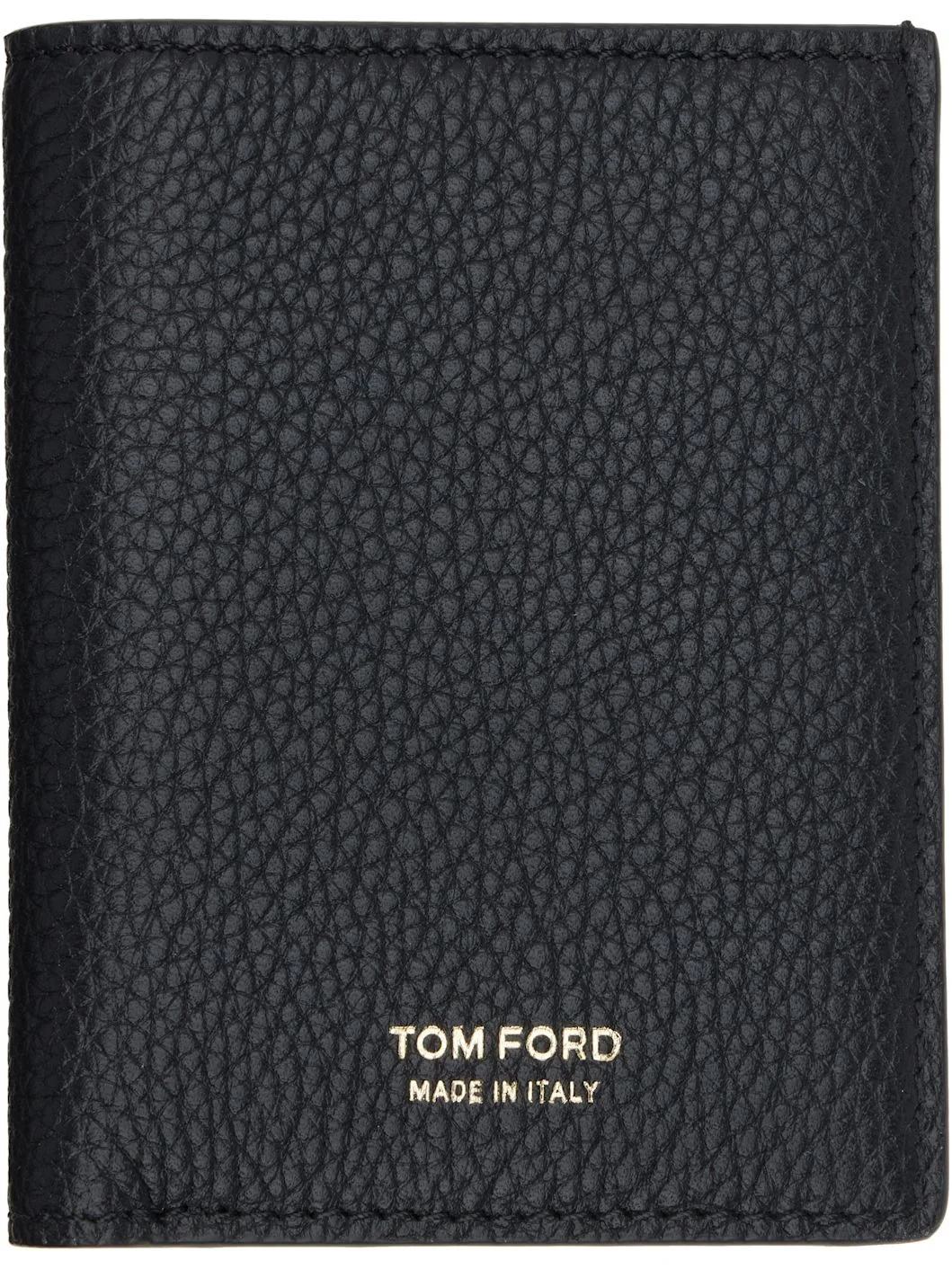 Pebble-grained calfskin bifold card holder. · Gold-tone logo stamp at face · Six card slots at interior · Moire lining · H4" x W3" x D0.25" Supplier color: Black Calfskin. Made in Italy 252076M163013