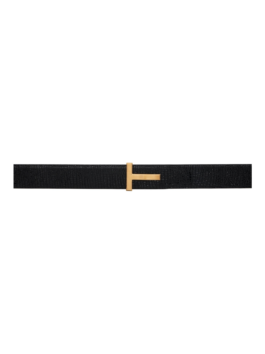 Reversible croc-embossed leather belt in black. Reverse in black buffed leather. · Logo hardware at post-stud fastening · W1.5" Supplier color: Black
