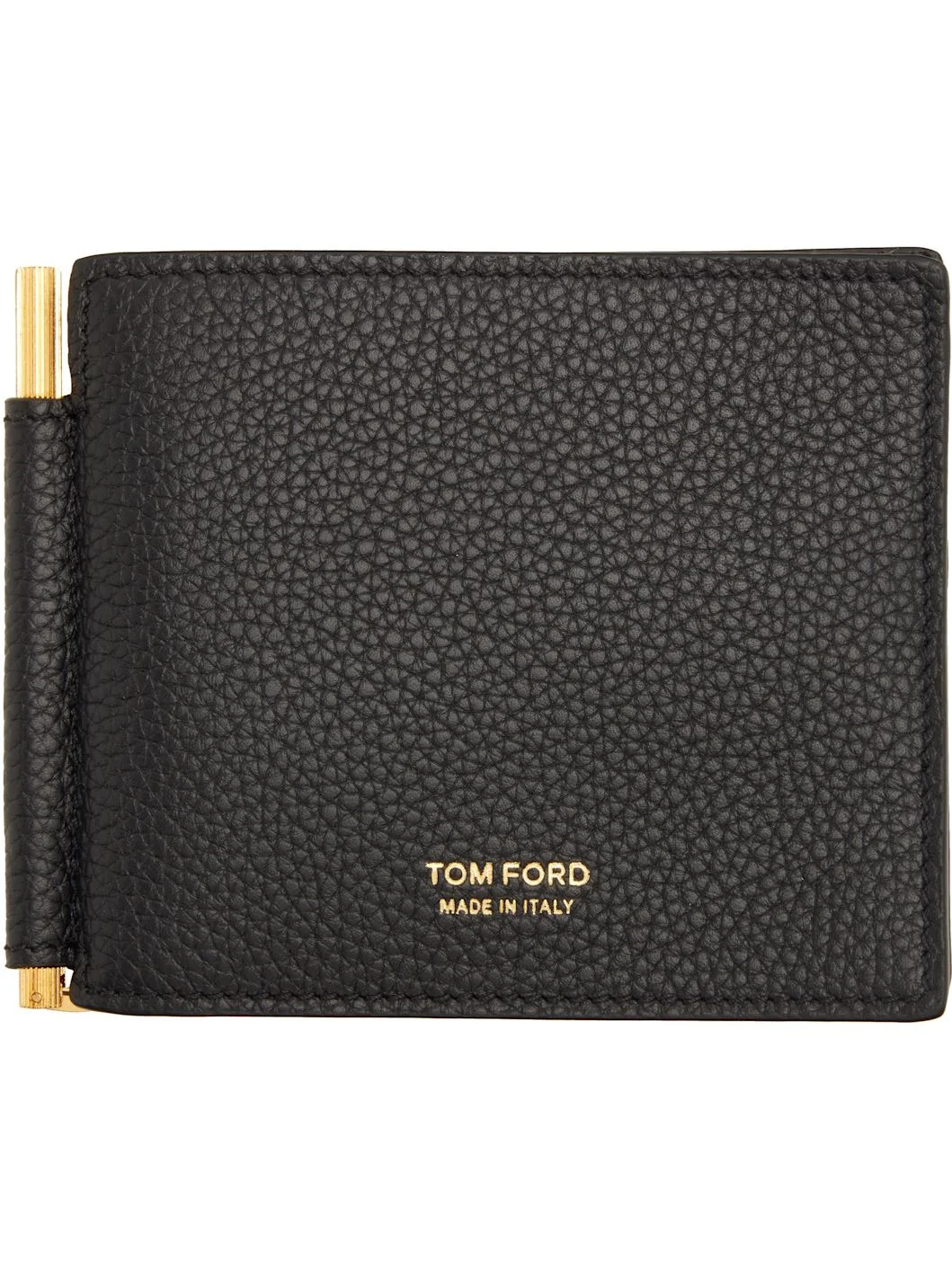 Pebble-grained calfskin bifold wallet. · Gold-tone logo stamp at face · Logo-engraved money clip at interior · Eight card slots · Sheepskin interior · Gold-tone hardware · H3.5" x W4" x D0.5" Supplier color: Black Calskin. Made in Italy 252076M164012