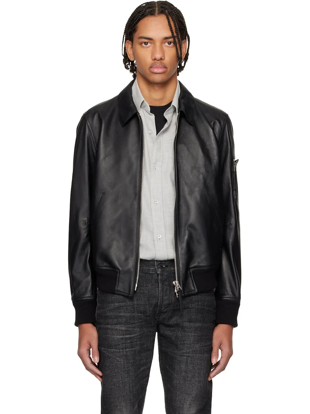 Grained lambskin jacket. · Spread collar · Two-way zip closure · Welt pockets and embossed logo at waist · Rib-knit hem and cuffs · Utility pocket at sleeve · Welt pocket at interior · Cotton-blend twill lining · Logo-engraved silver-tone hardware Supplier color: Black Body: 100% lambskin. Body lining: 56% cotton, 44% viscose. Sleeve lining: 61% cupro, 39% viscose. Pocket lining: 100% cotton. Trim: 90% cotton, 8% polyamide, 2% elastane. Made in Italy 261076M181001