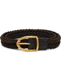 Braided calfskin suede belt. · Logo-engraved pin-buckle fastening · Gold-tone hardware · W1" Supplier color: Chocolate Calfskin. Made in Italy 252076M131005