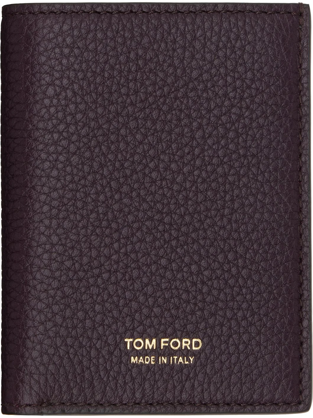 Pebble-grained calfskin bifold card holder. · Gold-tone logo stamp at face · Six card slots at interior · Moire lining · H4" x W3" x D0.25" Supplier color: Oxblood Calfskin. Made in Italy 252076M163011
