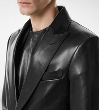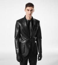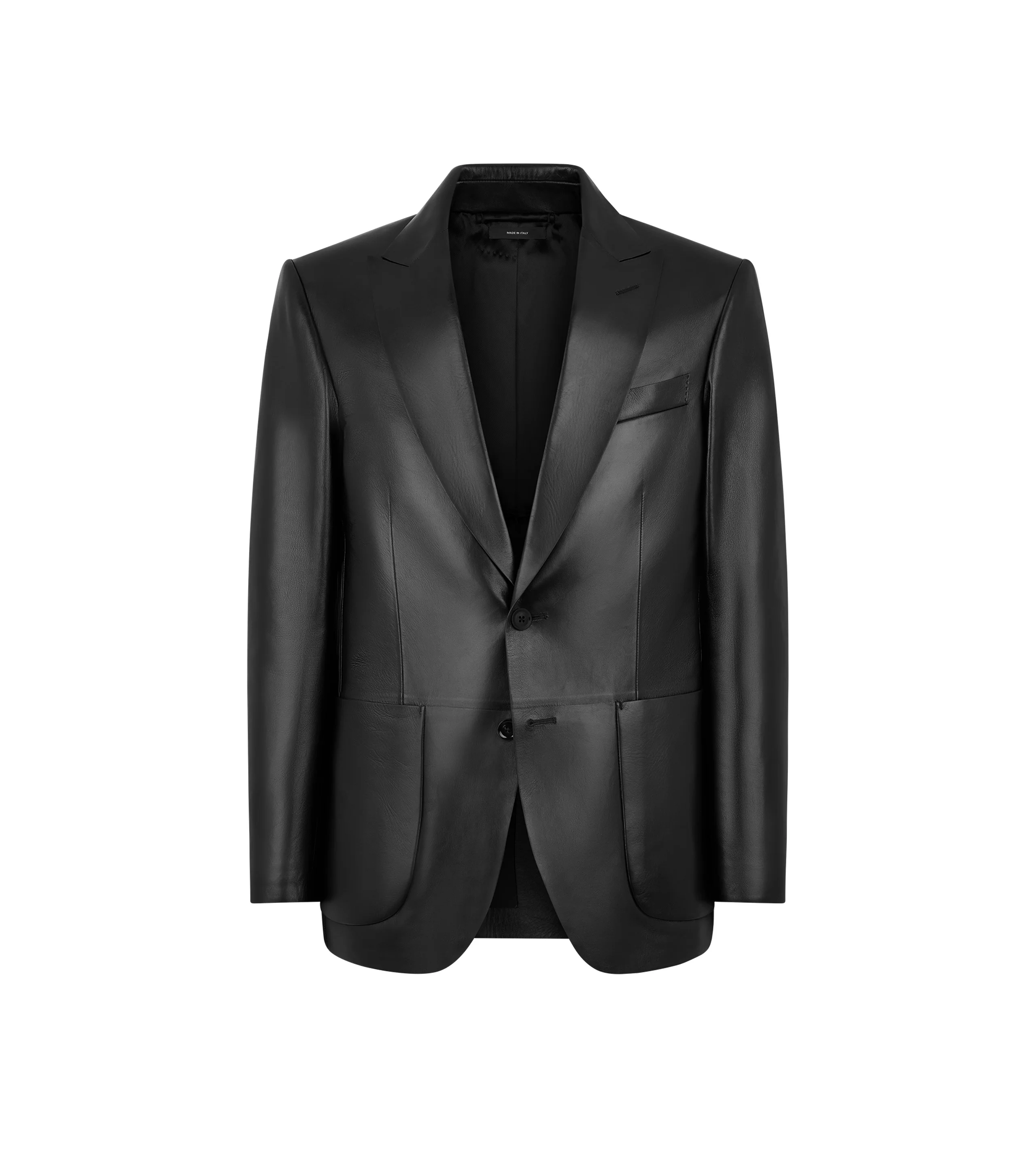 PRODUCT NO: LJT017-LMN022 This half lined blazer in lambskin leather introduces a glossy surface and sculptural silhouette. Signature horn buttons and a TOM FORD tailoring essential reimagined complete this piece. Composition: 100% lambskin leather. Made in Italy.