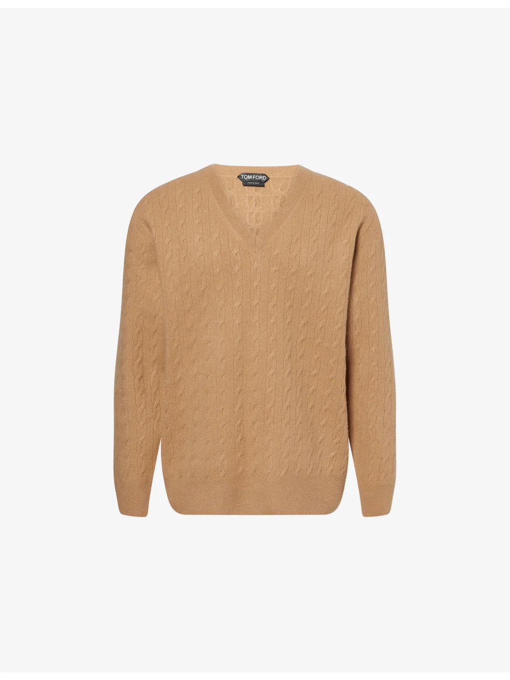 PRODUCT DETAILS - Tom Ford wool jumper - 100% wool - Relaxed fit, v neck, long sleeves, all-over cable knit, ribbed trims - Dry clean - Made in Italy - Model is 6ft 1in/1.85m and wears a size UK 40 - Midweight, stretchy Ref: R04607577