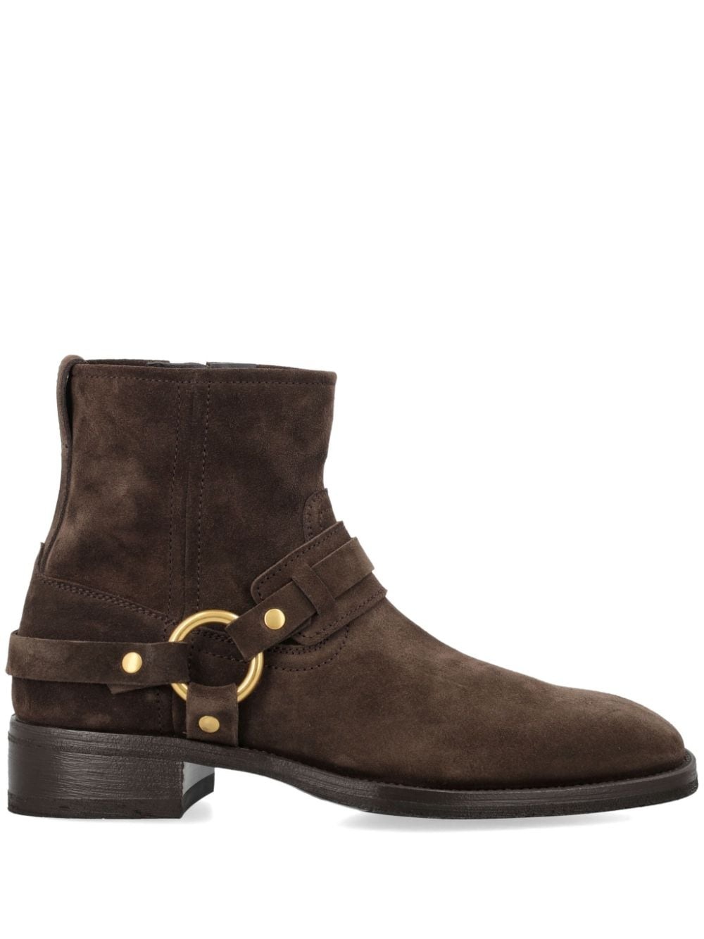 buckle-embellished ankle boots Highlights - Brown - Calf suede - Almond toe - Gold-tone hardware - Side zip fastening - Branded leather insole - Pull-tab at the heel - Flat leather sole Made in Italy Composition Outer: Calf Suede 100% Lining: Calf Leather 100% Sole: Calf Leather 100%
