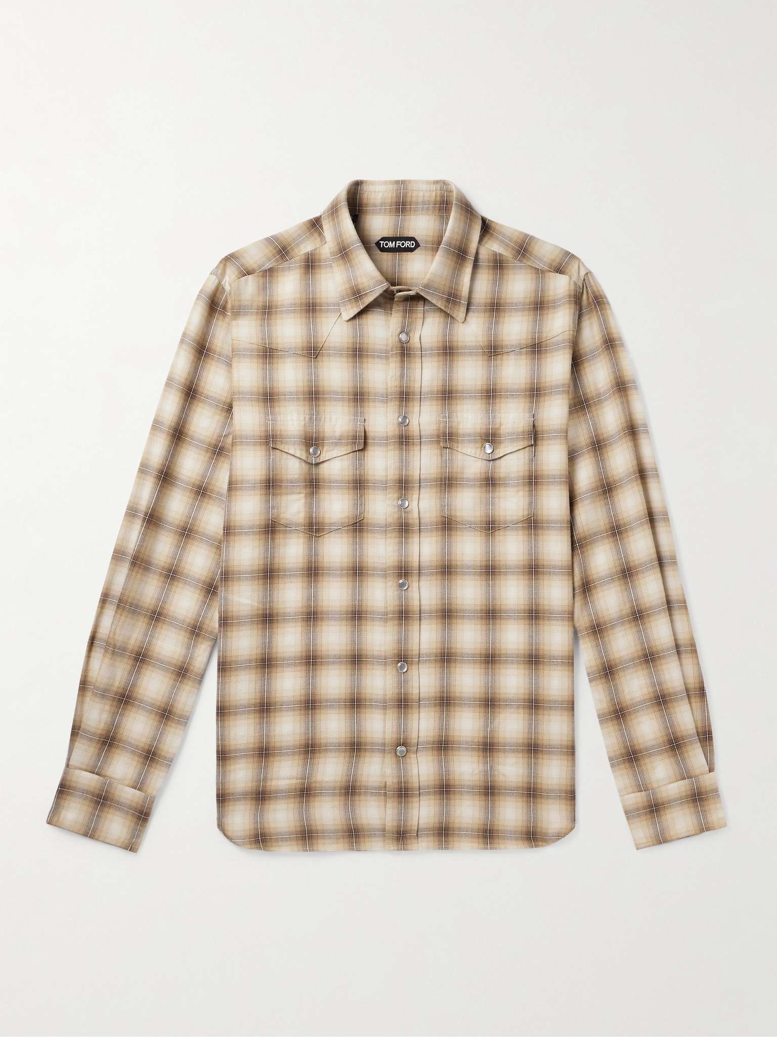 TOM FORD's checked shirt takes a clear cue from Western styles. It's made from a breathable cotton-blend and finished with two chest pockets beneath the angled yoke. Size & Fit - Fits true to size. Take your normal size - Designed for a relaxed fit - Mid-weight, non-stretchy fabric - Model is shown wearing an EU 39 (UK/US 15.5) - Model measures: chest 38"/ 96cm, height 6'0"/ 183cm Details & Care - Tonal-brown, beige and white cotton-blend - Snap fastenings - 59% cotton, 41% viscose - Machine wash