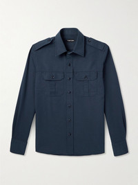 TOM FORD's shirt is a luxe take on military style. It's been made in Italy from cotton and silk-blend poplin and has the hallmarks of a uniform, like flap pockets and epaulettes. Lean into the brand's sleek aesthetic and with slim-fitting jeans. Size & Fit - Fits true to size. Take your normal size - Take the next size up if you wish to achieve a looser fit - Designed for a regular fit - Mid-weight, non-stretchy fabric - Model is shown wearing an EU 39 (UK/US 15.5) - Model measures: chest 38"/ 96cm, height 6'2"/ 188cm Details & Care - Navy cotton and silk-blend poplin - Button fastenings - 65% cotton, 35% silk - Hand wash