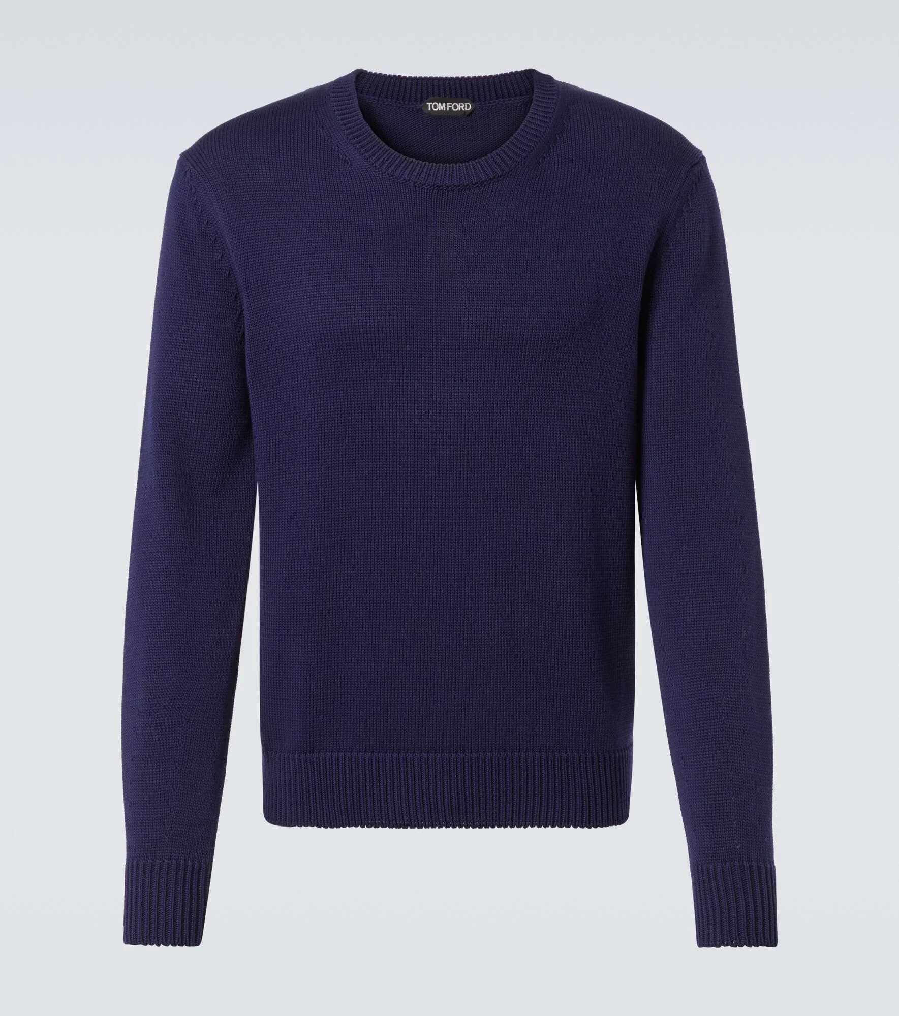 Knitted from pure cotton and silk yarns, this classic sweater from Tom Ford comes with ribbed trims. The crewnesk design is finished with tonal stitching and slightly dropped shoulders. Product Details - Material: 70% cotton, 30% silk - Care instructions: dry clean - Made in Italy - Designer color name: Navy Blazer - Item color: blue - Collar: crewneck - Cuff: ribbed - Hem: ribbed - Item number: P01097170 Size & Fit - True to size - Straight fit - Slightly stretchy fabric - Falls to the hip - The model in the picture is 185cm-6'1" and wearing a size IT 50