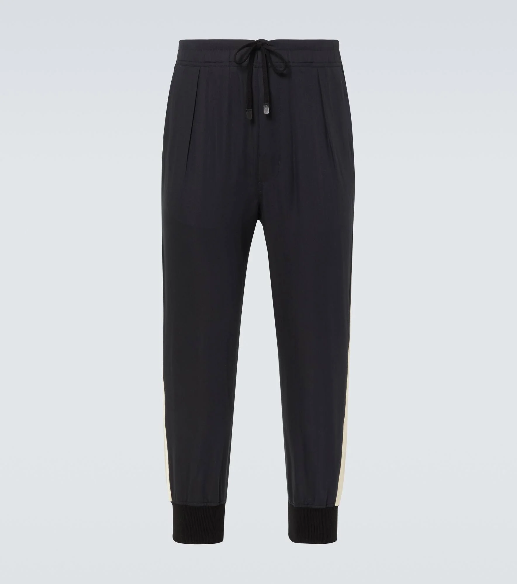 Product Details - Material: 90% cotton, 10% silk - Care instructions: dry clean - Made in Italy - Designer color name: Black & Chalk - Item color: black - Material II: 100% calf leather - Material III: 90% cotton, 8% polyamide, 2% elastane - Details: 100% water-buffalo horn - Pockets: side slit pockets, back pockets - Drawstring waist - Item number: P01042743 Size & Fit - True to size - Elasticated waist - Adjustable at the waist - Non-stretchy fabric - Tapered leg - The model in the picture is 185cm-6'1" and wearing a size 32