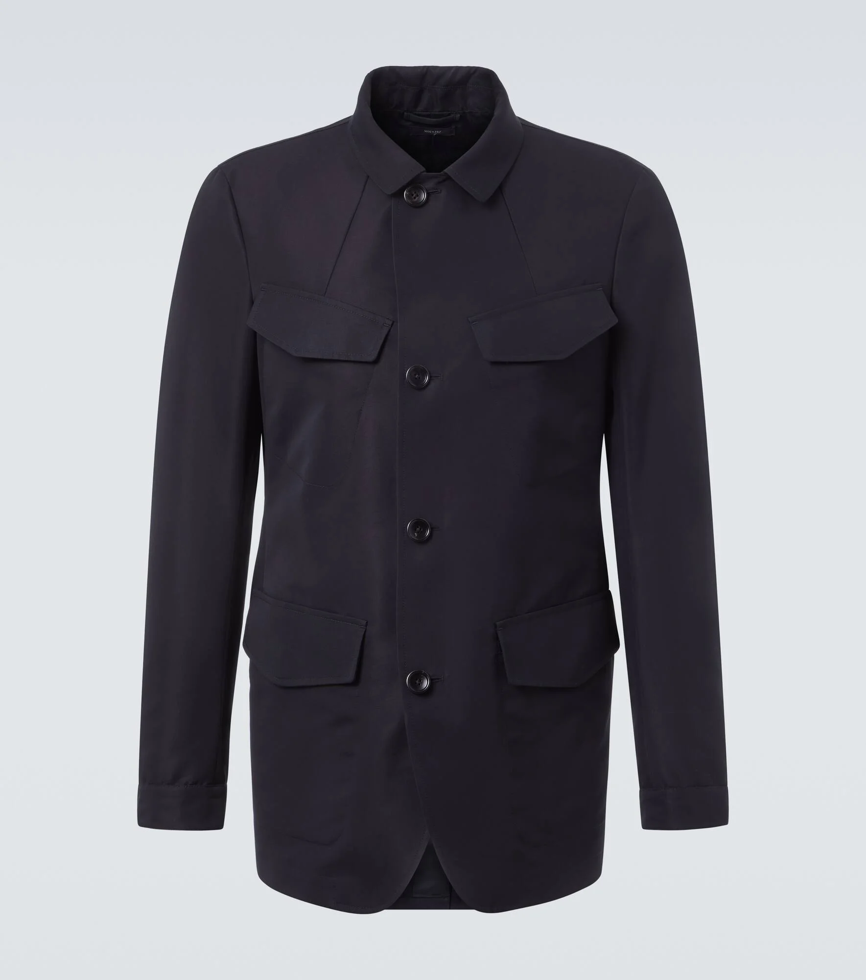 Tom Ford showcases meticulous attention to detail with a dose of high-octane glamour. This field jacket has an asymmetric button placket and cotton-blend construction. Product Details - Material: 62% cotton, 38% polyester - Care instructions: specialist clean - Made in Italy - Color: black - Designer color name: Black - Item color: black - Lining: 56% cotton, 44% viscose - Sleeve lining: 61% cupro, 39% viscose - Pocket lining: 100% cotton - Details: 100% calf leather - Contains non-textile parts of animal origin - Closure: two-way zipped front, buttoned front - Pockets: snap-buttoned pockets - Cuff: buttoned - Item number: P01097197 Size & Fit - True to size - Straight fit - Non-stretchy fabric - Falls below the hip - The model in the picture is 185cm-6'1" and wearing a size IT 50