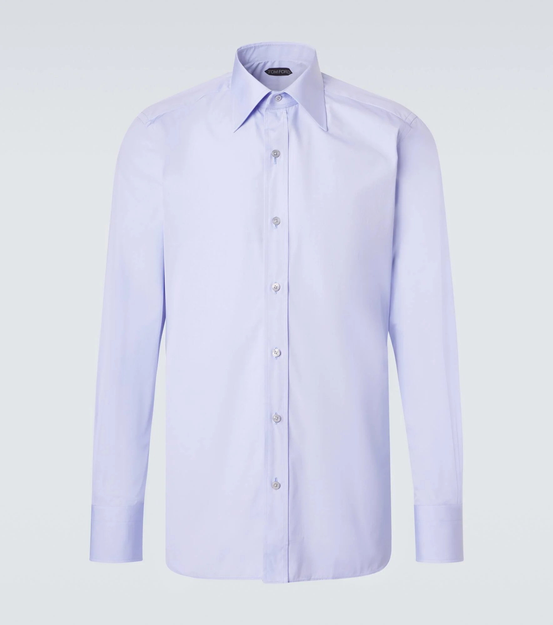 Tom Ford’s tailoring showcases meticulous attention to detail with a dose of high-octane glamour. This classic shirt is made from crisp cotton poplin and finished with a pointed collar. Product Details - Material: 100% cotton - Care instructions: machine wash at 40 degrees - Made in Italy - Color: blue - Designer color name: Powder Blue - Contains non-textile parts of animal origin - Closure: buttoned front - Cuff: two buttons - Hem: gusset - Item number: P01097237 Size & Fit - True to size - Without pleats in the back - Slim fit - Darts in the back - Non-stretchy fabric - Falls below the hip - The model in the picture is 185cm-6'1" and wearing a size EU 41