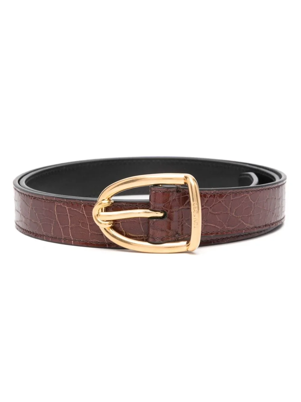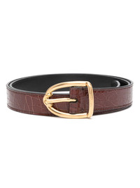 crocodile-effect leather belt Highlights - Chocolate brown - Calf leather - Embossed crocodile effect - Polished finish - Logo-engraved gold-tone hardware - Gold-tone buckle fastening - Punched holes - Adjustable fit Made in Italy Composition Outer: Calf Leather 100%, Brass 100% Lining: Calf Leather 100% SIZE & FIT Measurement Maximum Length 37.4 in(95 cm) Minimum Length 33.46 in(85 cm) WIDTH 1.37 in(3.5 cm)