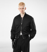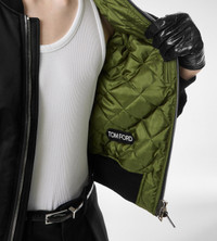 PRODUCT NO: OBB010-FMS072 This bomber fuses silk with diamond quilt lining in a contrasting tone. T-embossed detailing, leather trims, and knit finishes reflect TOM FORD’s mastery of luxurious textures in modern silhouettes. Composition: 100% silk. Diamond quilt lining. Made in Italy.