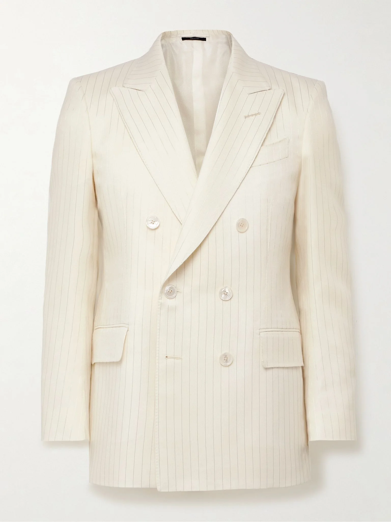 Tailoring is always a standout of TOM FORD's collections. This ‘Dyllan’ suit jacket is cut from a wool-blend with a double-breasted front, wide peak lapels and a single vent to prevent creasing when seated. The metallic stripes add a touch of dimension. Size & Fit - Fits true to size. Take your normal size - Those with broad shoulders may wish to take the next size up - Regular cut blazer, tailored for a comfortable fit - Internal shoulder pads - Mid-weight, non-stretchy fabric - Model is shown wearing an IT 48 - Model measures: chest 38"/ 96cm, height 6'1"/ 185cm Details & Care - White and silver wool-blend - Peak lapels, functioning buttoned cuffs, chest welt pocket, two front flap pockets, single vent, fully lined - Double-breasted button fastenings - 70% wool, 29% silk, 1% viscose; buttons: 100% horn (Buffalo); lining: 59% cupro, 41% silk - Dry clean - Mother-of-pearl: Australia