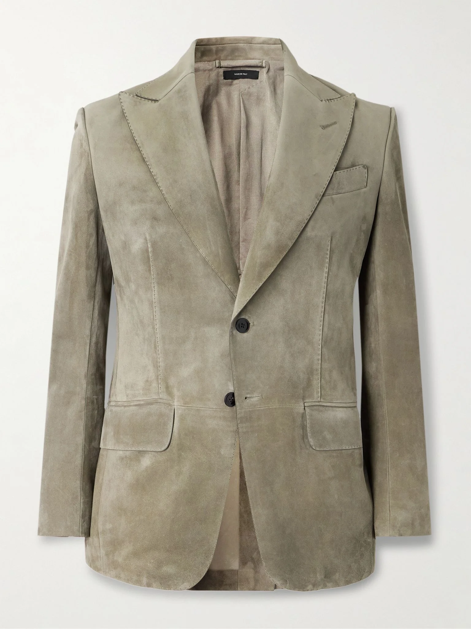 Elegant materials and sharp tailoring define TOM FORD's signature line of 'Dyllan' blazers. This version has been made in Italy from supple suede and features distinctive design details, including peak lapels, padded shoulders and refined horn buttons. Wear yours over a rollneck. Size & Fit - Fits true to size. Take your normal size - Regular cut blazer, tailored for a comfortable fit - Internal shoulder pads - Supple, non-stretchy suede - Model is shown wearing an IT 48 - Model measures: chest 38"/ 96cm, height 6'1"/ 185cm Details & Care - Mushroom suede - Peak lapels, padded shoulders, non-functioning buttoned cuffs, chest welt pocket, two front flap pockets, internal pockets, single vent, partially lined - Two button fastening - 100% suede (Calf); buttons: 100% horn (Buffalo) - Specialist clean