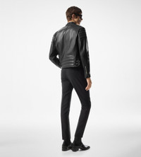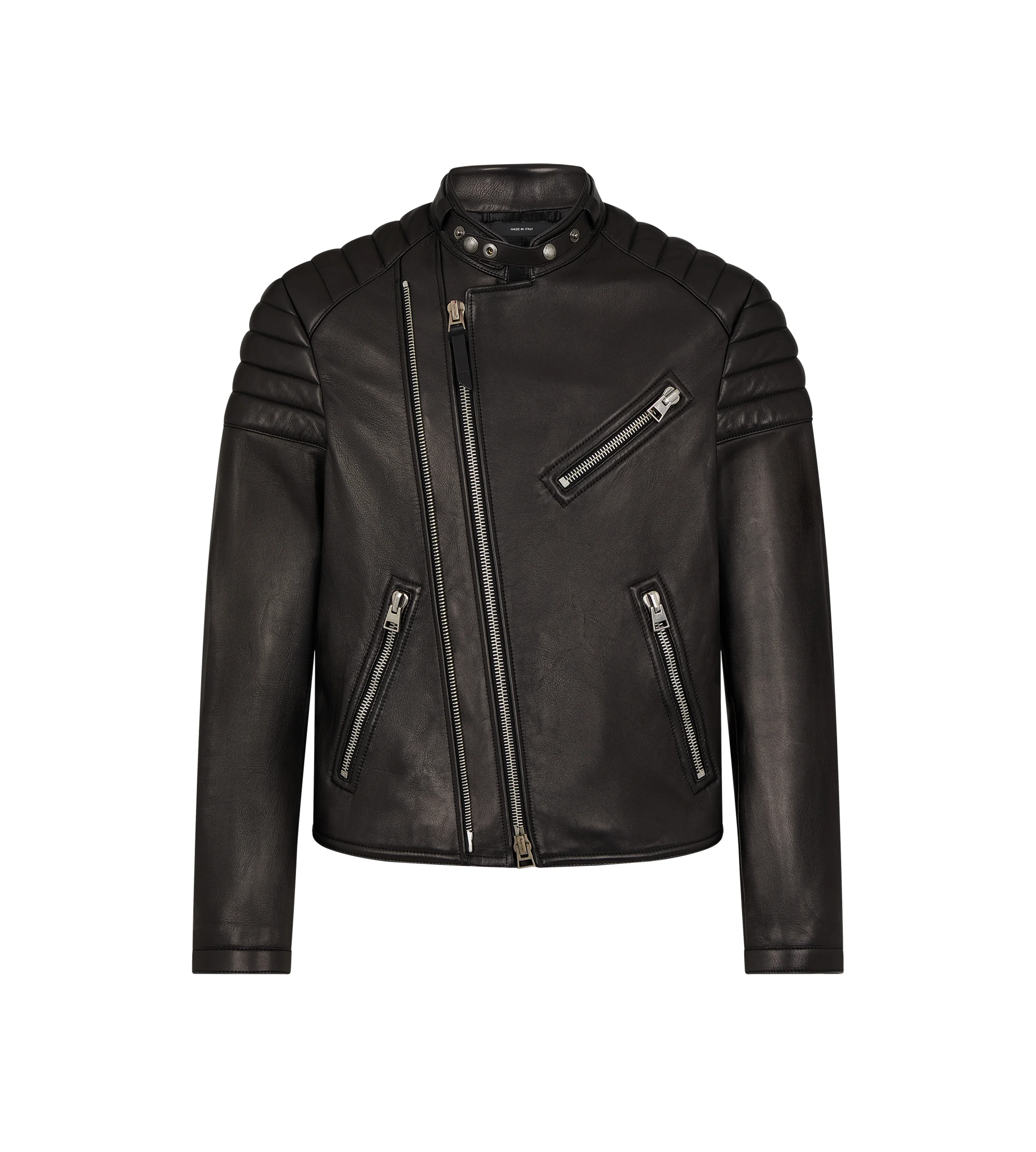 - FULLY LINED ICON BIKER JACKET - CLASSIC BIKER COLLAR WITH PRESS STUD FASTENING - ASYMMETRICAL FULL ZIP THROUGH - MULTIPLE ZIP DETAILING - OVATTA (POLYESTER LIGHT PADDED FILL) SPONGING ALONG SHOULDER GIVES 3D APPEARANCE AND SHAPE - TOM FORD SIGNATURE DOUBLE ZIP CLOSURE - CENTER BACK LENGTH 60CM - 100% LEATHER - MADE IN ITALY