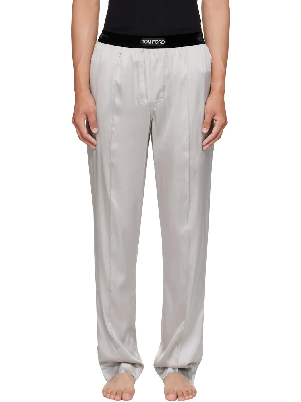 Stretch silk satin pyjama pants. · Loose-fit · Jacquard logo at velvet elasticized waistband · Four-pocket styling · Pinched seams at legs Supplier color: Light grey 93% silk, 7% elastane. Made in Italy 251076M218001