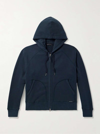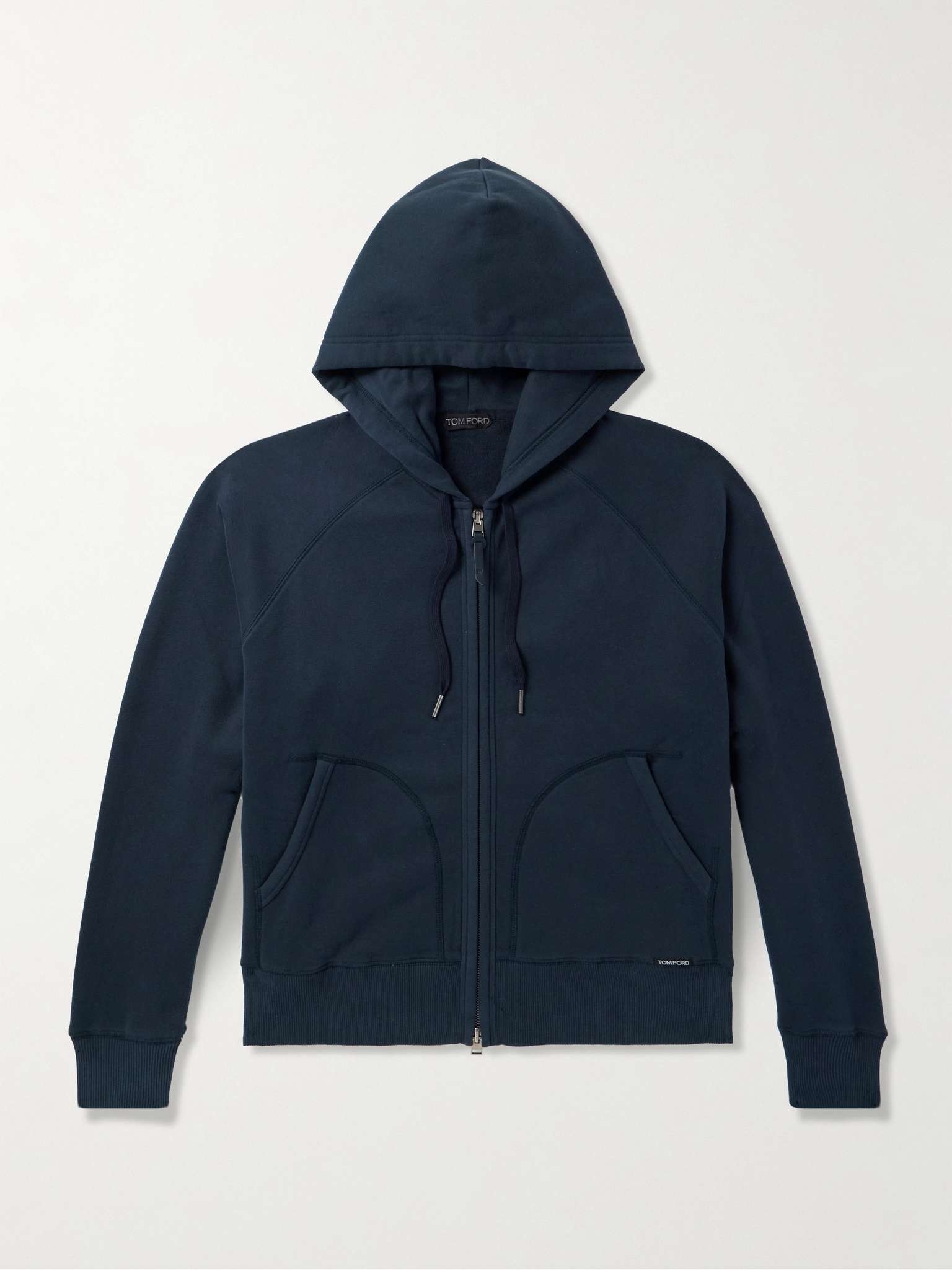 Even TOM FORD’s more casual pieces are made with close attention to detail, so this zip-up hoodie feels particularly neat and polished. It’s made from soft cotton-blend jersey with comfortable raglan sleeves and is tipped with leather at the fastening tab. Small to size. See Size & Fit notes. Size & Fit - Fits small to size. Take one size larger than normal - Designed for a slim fit - Ribbed hem - Mid-weight, slightly stretchy fabric - Model is shown wearing an IT 50 - Model measures: chest 38"/ 96cm, height 6'1"/ 185cm Details & Care - Navy cotton-blend jersey - Two-way zip fastening - 83% cotton, 17% polyester - Dry clean