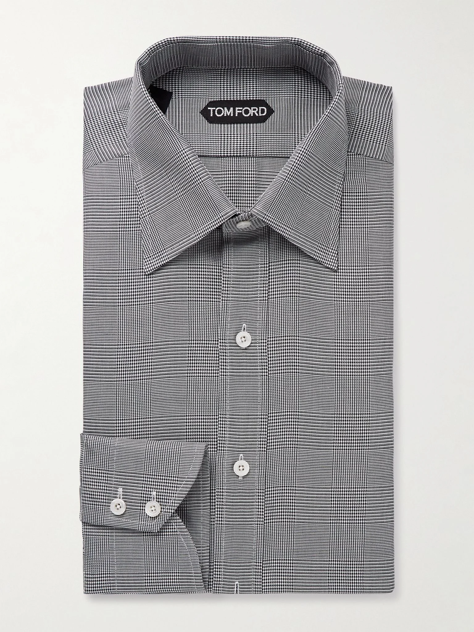 TOM FORD’s shirt is patterned with smart Prince of Wales checks that’ll add an element of interest to formal suiting. It’s tailored from crisp cotton-poplin and finished with mitered double-button cuffs and mother-of-pearl fastenings. Size & Fit - Fits true to size. Take your normal size - Those with broad shoulders may wish to take the next size up - Darted at the back to achieve a slim fit - Lightweight, non-stretchy fabric - Model is shown wearing an EU 39 (UK/US 15.5) - Model measures: chest 38"/ 96cm, height 6'2"/ 188cm Details & Care - Grey, black and white cotton-poplin - Button fastenings - 100% cotton - Machine wash - Mother-of-pearl: Australia