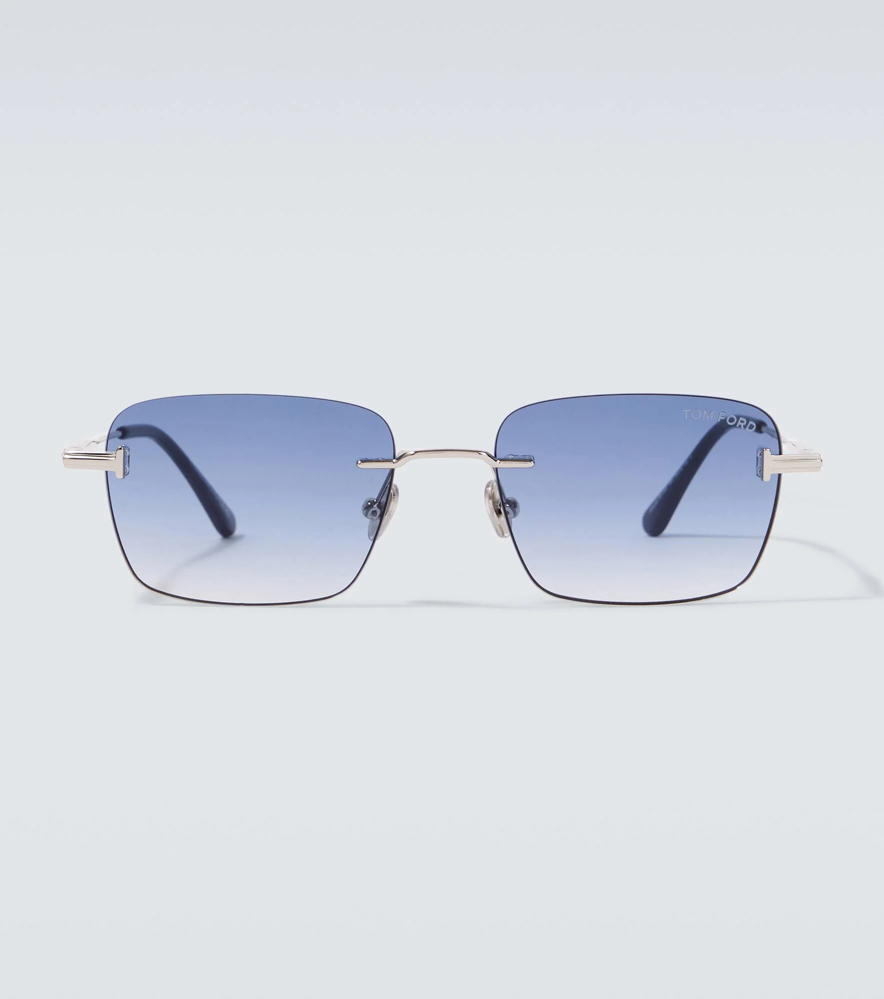 The Jake sunglasses from Tom Ford have a lightweight and chic frameless design. Made in Italy, the pair has silver-toned T logo detailing at the hinges. Product Details - Frame material: metal, acetate - Frame color: silver, blue - Lens filter category 2 - Color: blue - Lens color: blue - Made in Italy - Includes: case and presentation box, cleaning cloth - The color of the case may vary - Item number: P01129363 Size & Fit - Lens width: 54mm-2.15" - Bridge size: 18mm-0.7" - Earpiece length: 145mm-5.7"