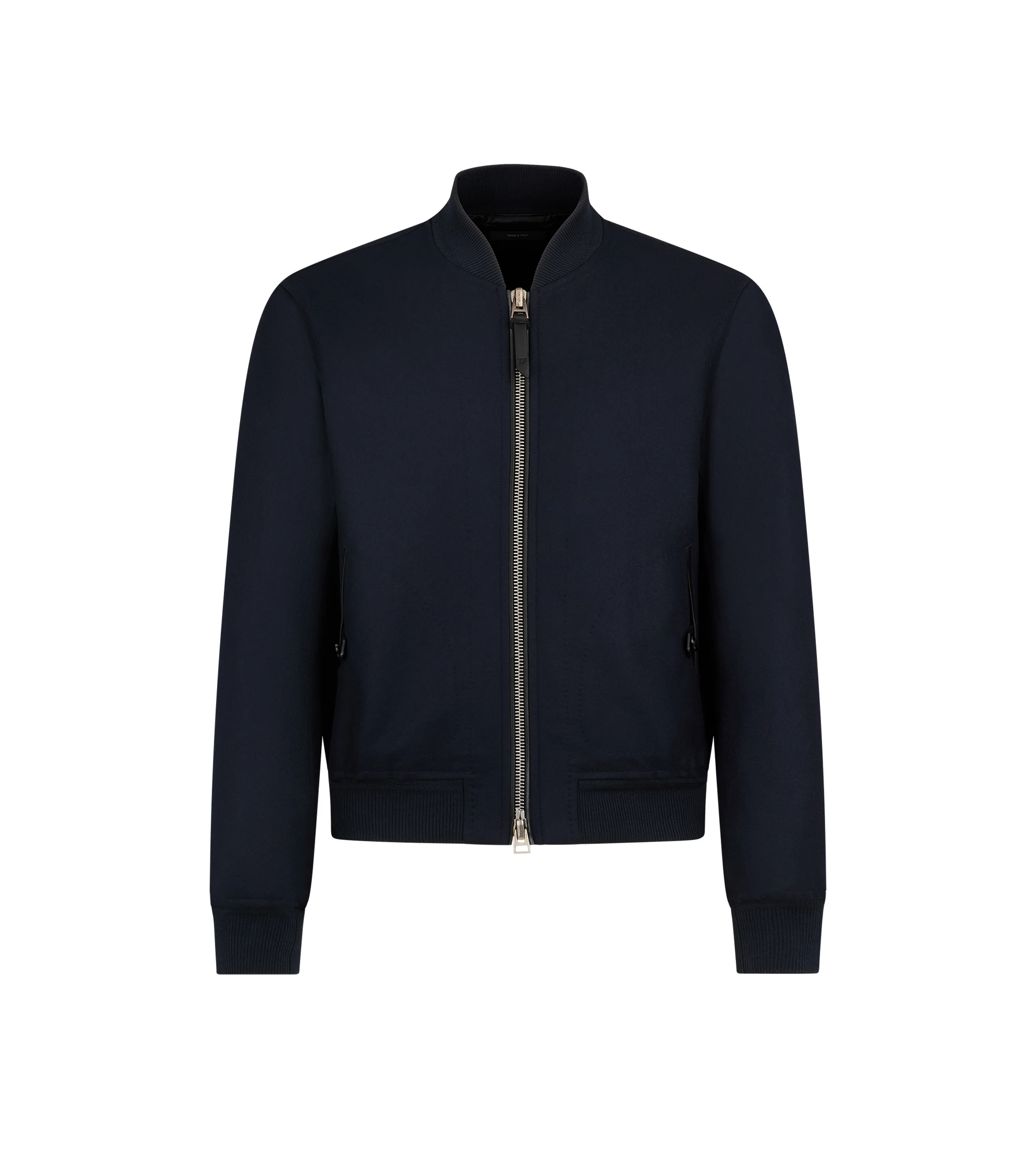 - FULLY LINED TRACK BOMBER - CLASSIC FIT - CONTRAST LEATHER FRAMING ALONG FRONT POCKETS - KNITTED RIB TRIMS ALONG COLLAR, WAIST AND CUFFS - ZIP POCKETS WITH SMOOTH LEATHER FRAMING - TOM FORD SIGNATURE DOUBLE ZIP CLOSURE - AMF STITCHING ALONG BOTH SIDES OF THE CENTER FRONT ZIP - CENTER BACK LENGTH 62CM - 100% WOOL - MADE IN ITALY