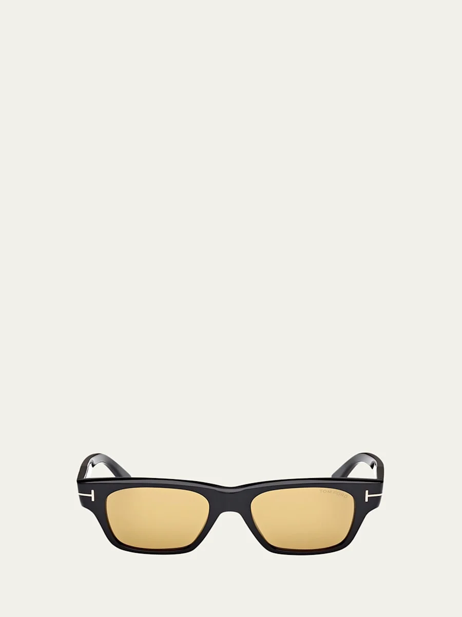 TOM FORD "Caine02" square sunglasses in sleek acetate Lens/bridge/temple (in mm): 5319145 Solidcolor lenses Left lens logo script Saddle nose bridge Signature metal T temple decoration Tapered arms Branded temple tips Acetate 100% UVA/UVB protection Made in Italy