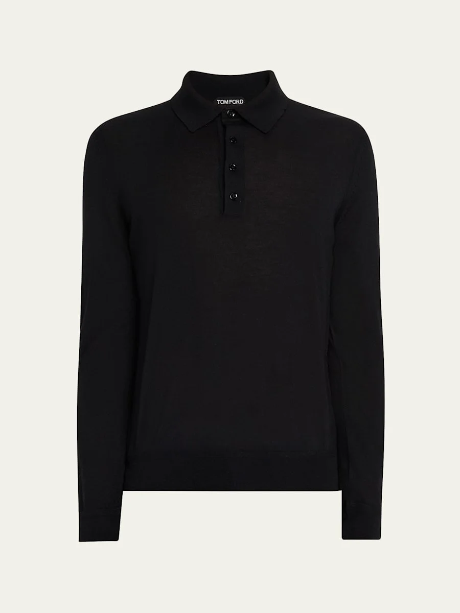 TOM FORD polo sweater in fine gauge cashmere and silk Genuine mother-of-pearl buttons Spread collar Four-button placket Long sleeves Ribbed cuffs and hem Pullover style Cashmere/silk Made in Italy Proposition 65 warning for California residents Online Inquiries: BGS21_NCU8M| Store Inquiries: #4952642